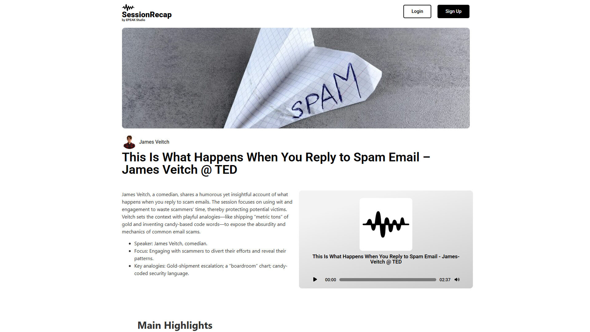 With SessionRecap's automated event summary tools, unlock value for your attendees. Did you miss a session, but don't have time to watch the full recording?
