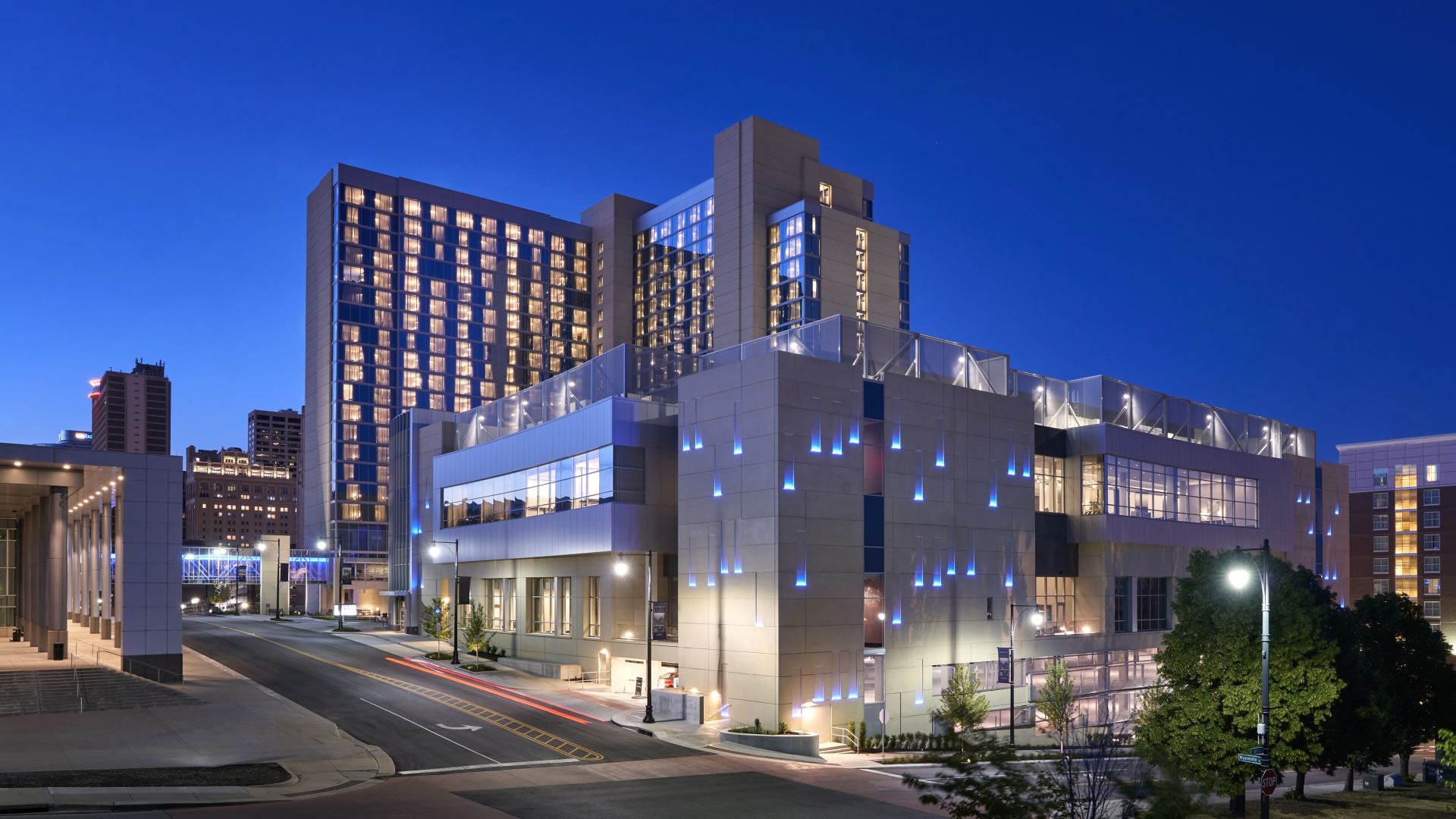 Opened in 2020, Loews Kansas City Hotel is a premier convention destination located in the heart of downtown. This modern hotel features 800 guestrooms, a lobby bar, multiple dining options, and an indoor saltwater lap pool. It connects directly to the Kansas City Convention Center via a pedestrian bridge, offering seamless access for event attendees.