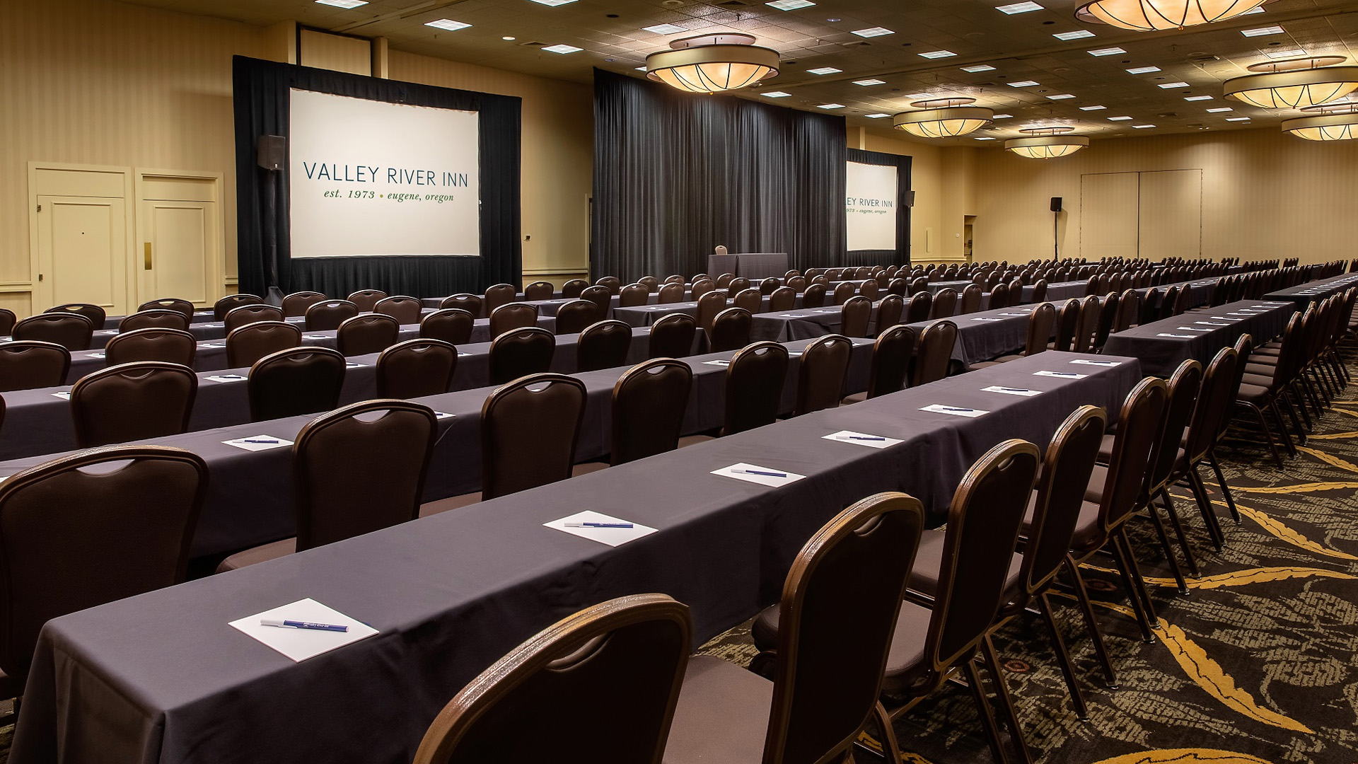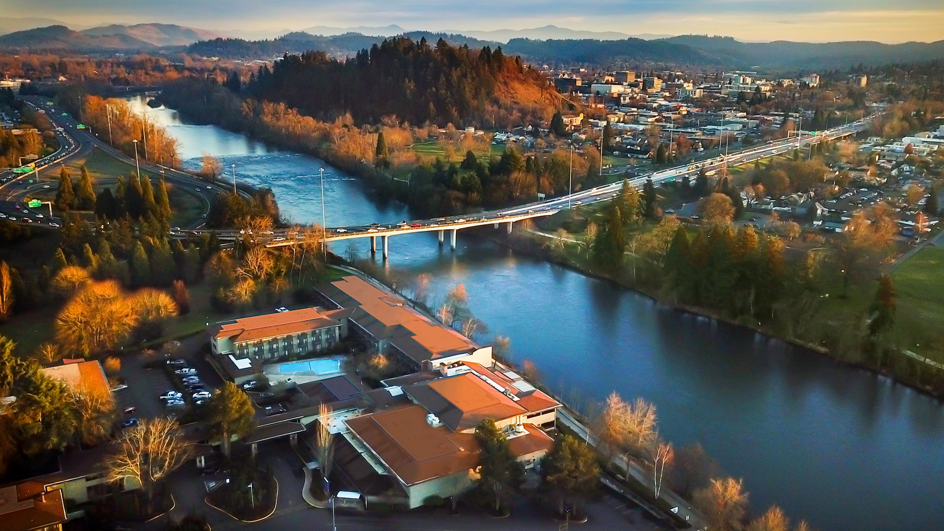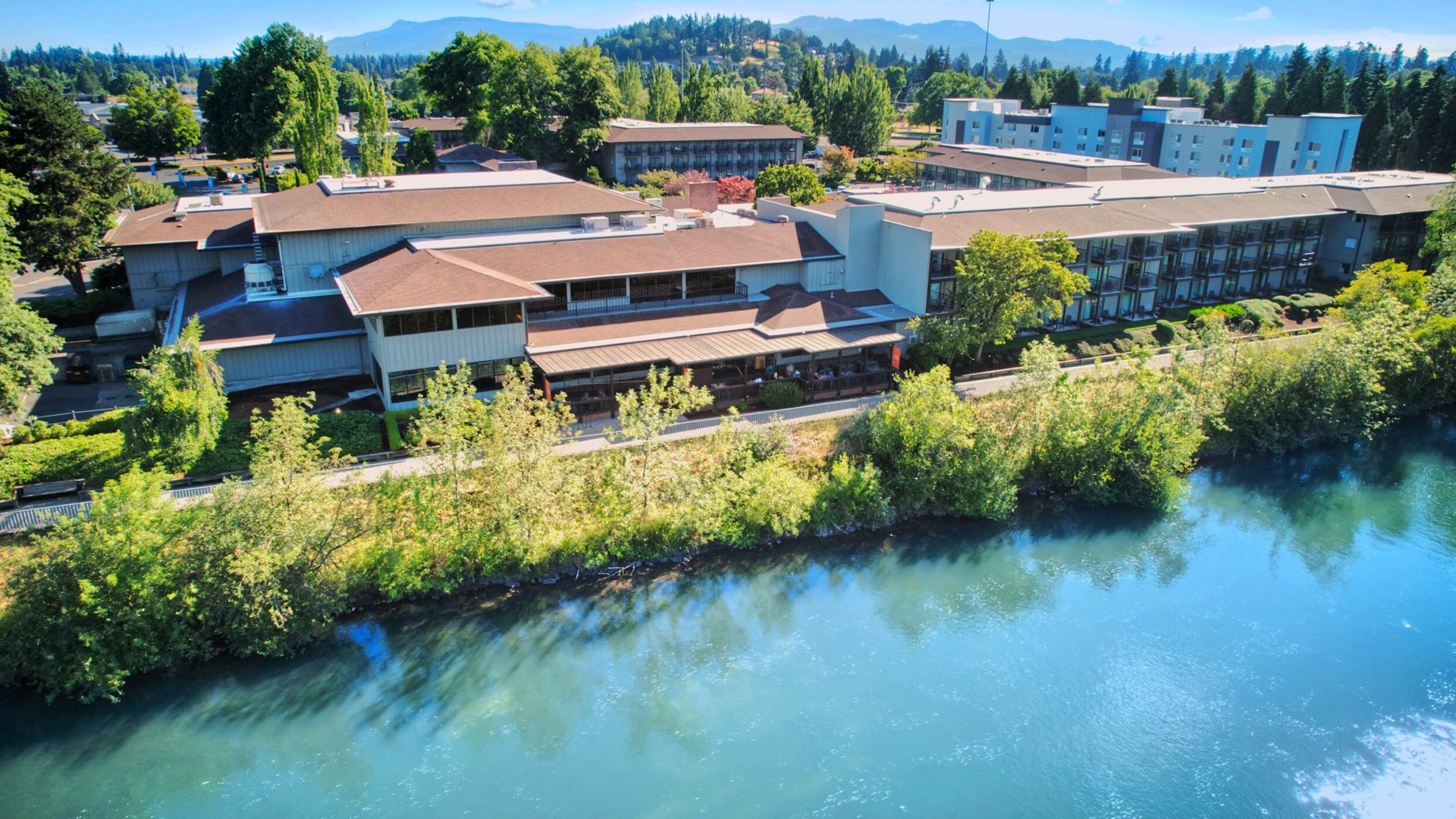 Located on the banks of the Willamette River, Valley River Inn features a modern rustic aesthetic inspired by the Pacific Northwest. Recently renovated, this Eugene hotel offers 259 guest rooms, the Sweet Waters on the River restaurant, and extensive event facilities adjacent to the Valley River Center.
