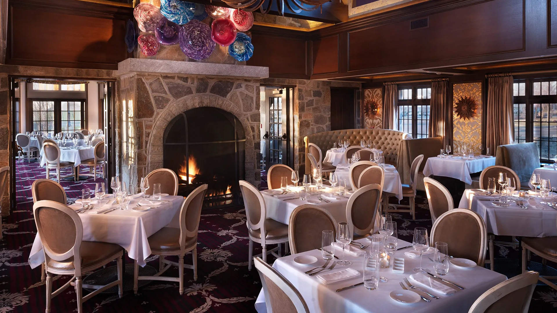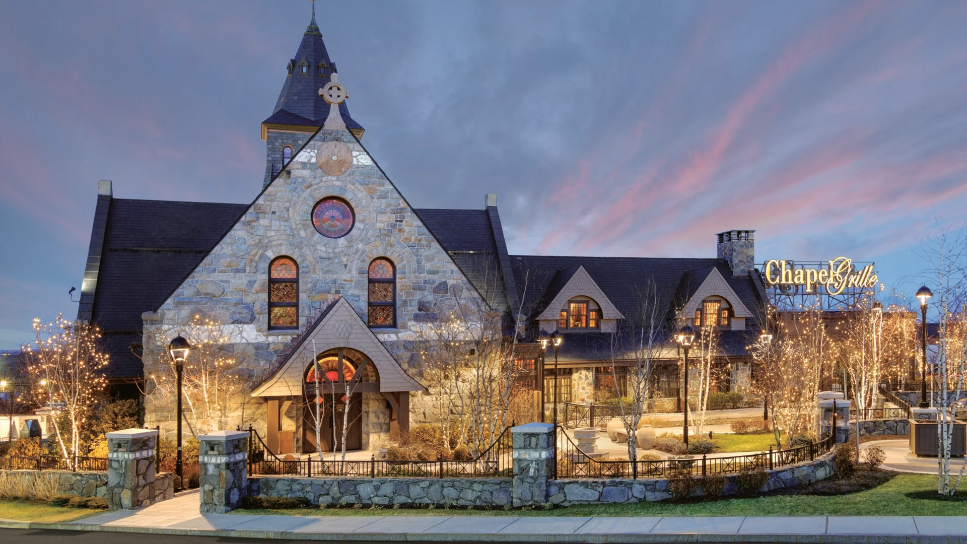 Located in a restored 1891 stone chapel atop a hill in Cranston, Chapel Grille offers Mediterranean-Italian cuisine with panoramic views of the Providence skyline. The venue features cathedral ceilings, a woodstone hearth, and elegant private dining spaces like the Wine Salon and Skyline Terrace, making it a premier destination for boutique weddings and social gatherings.